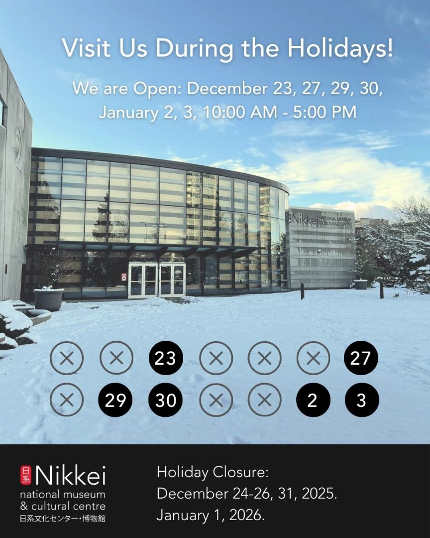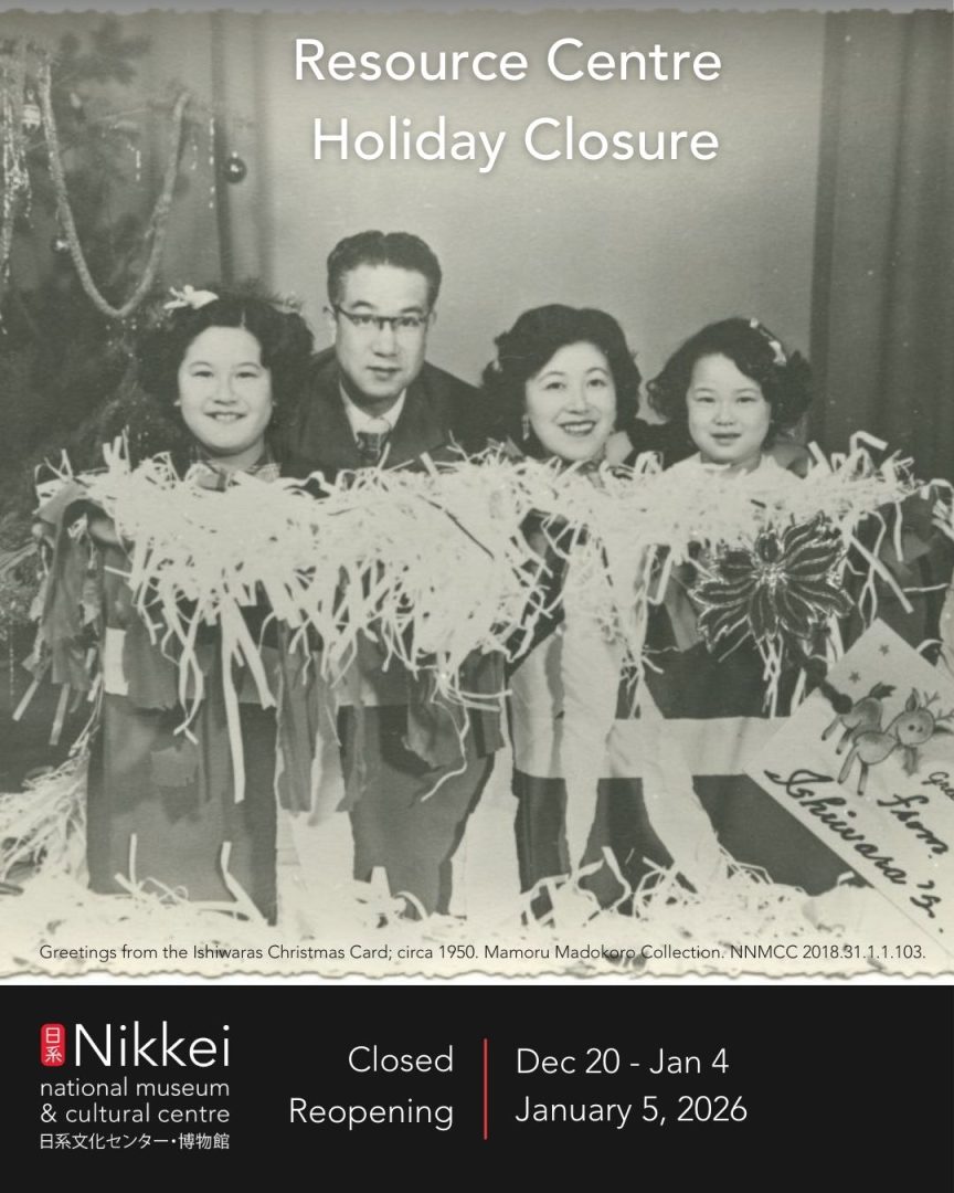 The Charles H. Kadota Resource Centre will reopen on Monday, January 5. For research inquiries, donation offers, loan requests, or to schedule an appointment, please email us at [email protected]. When open, research appointments are available by request Tuesday to Friday and some Mondays. Continue to explore our collections online at www.nikkeimuseum.org.